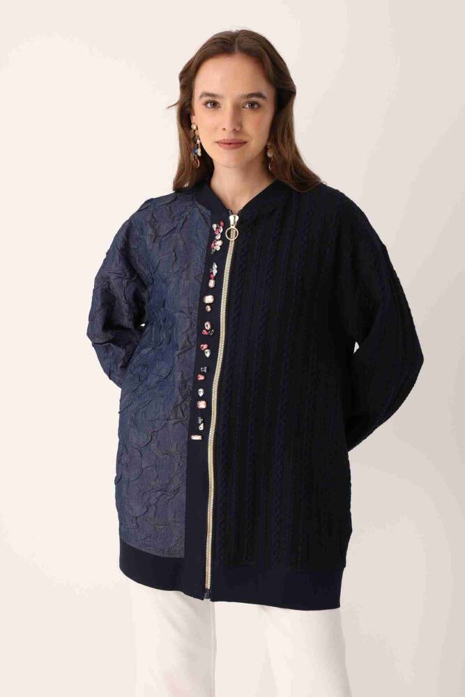 Fermuar kapamalı, brokar kumaş mixli, taş işlemeli, oversize rahat kalıp ceket-